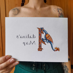 In the preparatory module, I also painted a map depicting the journey of Adalina and Eggbert. I have since transformed this into a Turkish map fold book, adding compass and navigation details, illuminated lettering on the cover, and a hidden pattern within the folds of the map itself. This was also printed on 120gsm cartridge paper. Initially, I was going to add decorative borders to the cover but following tutorials I went for a more minimalist design.