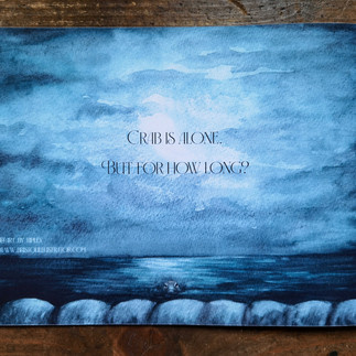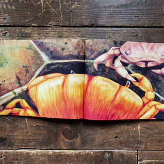 Upon initial sketching, I determined that watercolour full-page illustrations, akin to those found in an art book, would best compliment my story. Opting for landscape dimensions, I sought to imbue the book with a sense of vast expanse reflective of the ocean's magnitude, intending to emphasise the crab's diminutive presence amidst it all.